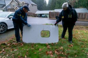 FILE PHOTO: National Transportation Safety Board (NTSB) investigators examine the fuselage plug area of Alaska Airlines Flight 1282 Boeing 737-9 MAX, which was jettisoned and forced the aircraft to make an emergency landing, at a property where it was recovered in Portland, Oregon, U.S. January 8, 2024. NTSB/Handout via REUTERS. THIS IMAGE HAS BEEN SUPPLIED BY A THIRD PARTY/File Photo