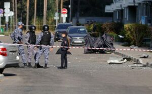 Law enforcement officers stand guard outside a damaged multi-storey residential building following an alleged Ukrainian drone attack in the course of Russia-Ukraine conflict, in Ramenskoye in the Moscow region, Russia September 10, 2024. REUTERS/Maxim Shemetov