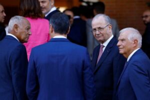 Palestinian Prime Minister Mohammad Mustafa stands with European Union foreign policy chief Josep Borrell, Secretary-General of the Arab League Ahmed Aboul Gheit and Spanish Prime Minister Pedro Sanchez on the day of a meeting at Moncloa Palace in Madrid, Spain, September 13, 2024. REUTERS/Susana Vera