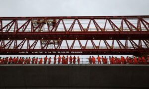 FILE PHOTO: Workers gather as the final deck segment of HS2’s 2.1-mile long viaduct crossing the Colne Valley is lowered and fixed into place, making it Britain’s longest rail bridge, in Denham, Britain, September 5, 2024. REUTERS/Suzanne Plunkett/File Photo