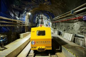 FILE PHOTO: A view of a cable car that transports workers, scientists, and visitors down a 1,266-metre-long slope tunnel to 700 metres underground, where the central detector at the Jiangmen Underground Neutrino Observatory (JUNO) is located, during a media tour organised by the Chinese foreign ministry and the Chinese Academy of Sciences (CAS), in Kaiping, Guangdong province, China October 11, 2024. REUTERS/Ryan Woo/File Photo