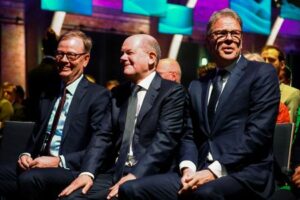 FILE PHOTO: German Chancellor Olaf Scholz speaks with the Chief Executive of Germany’s Banks’ Association Heiner Herkenhoff alongside CEO of Deutsche Bank Christian Sewing, as they attend Banking Day, a gathering of bankers hosted by Germany’s Banks’ Association, in Berlin, Germany April 23, 2024. REUTERS/Liesa Johannssen/File Photo