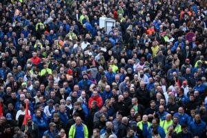 Workers of Europe’s largest carmaker Volkswagen AG gather during a briefing of the Works Council about VW’s plans to close down three plants and lay off thousands of employees at the VW headquarters in Wolfsburg, Germany, October 28, 2024. Julian Stratenschulte/Pool via REUTERS