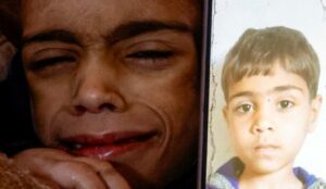 El niño palestino Mu’ath Mohamed Abu-Hagag, que según los médicos está desnutrido, llora mientras su madre muestra una foto suya antes de que le diagnosticaran desnutrición, en la UCI del hospital Nasser de Jan Yunis, en el sur de la Franja de Gaza. 7 de diciembre de 2024. REUTERS/Mohammed Salem