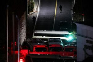 People walk near buses parked to protect impeached South Korean President Yoon Suk Yeol from a possible arrest attempt by the Corruption Investigation Office for High-ranking Officials, near his official residence in Seoul, South Korea, January 15, 2025. REUTERS/Kim Hong-Ji
