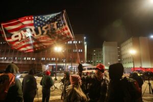 A man holds a flag as people wait outside the DC Central Detention Facility after U.S. President Donald Trump made a sweeping pardon of nearly everyone charged in the January 6, 2021 attack on the U.S. Capitol, in Washington, U.S. January 21, 2025. REUTERS/Jim Urquhart