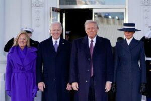 U.S. President-elect Donald Trump and his wife Melania Trump meet with U.S. President Joe Biden and first lady Jill Biden at the White House on inauguration day of Donald Trump’s second presidential term in Washington, U.S. January 20, 2025. REUTERS/Nathan Howard
