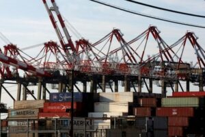 FILE PHOTO: Containers are stacked beneath cranes at Port Newark Container Terminal as U.S. East Coast and Gulf ports resumed operations Friday after unionised dockworkers reached a tentative labour agreement with an employer group for a new contract, ending a three-day strike in Newark, New Jersey, U.S., October 4, 2024. REUTERS/Mike Segar/File Photo