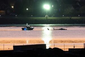 Rescatistas en un barco trabajan en el lugar del accidente después de que un helicóptero Black Hawk colisionara con el vuelo 5342 de American Eagle, que se aproximaba al Aeropuerto Nacional Reagan de Washington, y se estrellara en el río Potomac, a las afueras de Washington, EEUU. 30 de enero de 2025. REUTERS/Kevin Lamarque