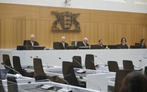 The judges with Chief Judge Herbert Anderer (3rdL) sit in the courtroom of the Higher Regional Court in Stuttgart-Stammheim, southern Germany, on February 13, 2025, on the first day of the trial of a defendant for murdering a police officer and attempting to murder five others at the market square in Mannheim on May 31, 2024. THOMAS KIENZLE/Pool via REUTERS