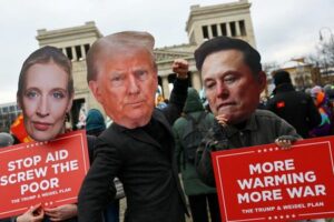 Personas con cabezas recortadas del presidente estadounidense Donald Trump, Elon Musk y la colíder del partido Alternativa para Alemania (AfD) Alice Weidel asisten a una protesta al margen de la Conferencia de Seguridad de Múnich (MSC), en Múnich, Alemania. 14 de febrero de 2025. REUTERS/Kai Pfaffenbach