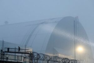 Rescuers work at the New Safe Confinement (NSC) structure, that covers the old sarcophagus which confines the remains of the damaged fourth reactor and bears an impact of what Ukrainian President Volodymyr Zelenskiy says was a Russian drone strike, amid Russia’s attack on Ukraine, at the Chornobyl Nuclear Power Plant, in Kyiv region, Ukraine February 14, 2025. REUTERS/Gleb Garanich