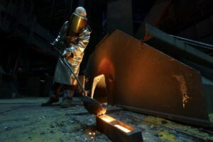FILE PHOTO: A steel worker in heat protection gear takes a sample of raw iron from Europe’s largest furnace with its daily raw iron production of 12,000 tons, at the steel plant of ThyssenKrupp in Duisburg, Germany, November 16, 2023. REUTERS/Wolfgang Rattay/File photo