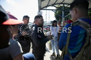 FOTO DE ARCHIVO. Oficiales de la policía de migración costarricense hablan con migrantes venezolanos en la frontera entre Costa Rica y Panamá mientras intentan regresar después de no poder cruzar a los Estados Unidos debido a las nuevas políticas de inmigración del presidente estadounidense Donald Trump, en Paso Canoas, Costa Rica. 12 de febrero de 2025. REUTERS/Maynor Valenzuela