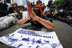 A woman gestures while lying down on the floor during an anti-government protest called ‘Indonesia Gelap’ (Dark Indonesia), against the recent budget cuts and other policies, near the presidential palace in Jakarta, Indonesia, February 21, 2025. REUTERS/Willy Kurniawan