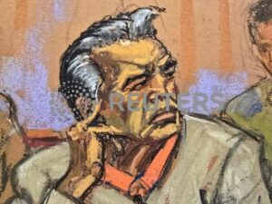 FOTO DE ARCHIVO. El presunto capo mexicano Ismael “El Mayo” Zambada escucha al intĂ©rprete de la corte mientras sostiene su auricular mientras el juez lo interroga sobre posibles conflictos de abogados durante una audiencia en un tribunal en Nueva York, Estados Unidos. 15 de enero de 2025. REUTERS/Jane Rosenberg