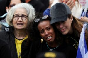 FOTO DE ARCHIVO: Personas reaccionan mientras ven la cobertura informativa, el día de la liberación de cuatro rehenes retenidos en Gaza desde el mortal ataque del 7 de octubre de 2023, y otros dos, que entraron en Gaza hace alrededor de una década y han estado retenidos allí desde entonces, como parte de un acuerdo de alto el fuego en Gaza entre Hamás e Israel, en Tel Aviv, Israel 22 de febrero de 2025. REUTERS/Ronen Zvulun/Fotografía de archivo