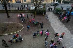 Imagen de archivo. Los niños de primaria se encuentran en grupos en el patio de una escuela mientras regresan al aula como parte de las regulaciones de la enfermedad del coronavirus (COVID-19) de Italia después de las vacaciones de Navidad, mientras que los alumnos mayores continúan sus estudios en línea, en Maleo, una de las ciudades originales de la ‘zona roja’ de Lombardía. 7 de enero de 2021. REUTERS/Marzio Toniolo