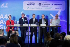 Ourania Georgoutsakou, Managing Director of Airlines for Europe, CEO of Lufthansa Carsten Spohr, CEO of International Airlines Group Luis Gallego, CEO of Air France-KLM Benjamin Smith, and CEO of Ryanair Michael O’Leary attend the Aviation Summit in Brussels, Belgium March 27, 2025. REUTERS/Yves Herman