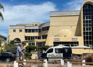 Varias personas caminan junto a un vehículo de la policía egipcia delante del hospital donde se encuentran los cuerpos de los extranjeros que murieron al hundirse un submarino turístico frente a la ciudad turística egipcia de Hurgada, en el mar Rojo, y cuyas nacionalidades aún se desconocen, en Hurgada, Egipto, 27 de marzo de 2025. REUTERS/Stringer