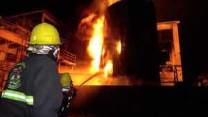 Firefighters work as huge fires erupted at a cement factory in Yemen after the Israeli military said it carried out airstrikes against Hodeidah Port and its vicinity, a day after the Iran-aligned Houthis fired a missile that struck near Israel’s main airport, at Bajil District, Hodeidah Governate, Yemen, May 5, 2025, in this still image taken from a handout video. AL-MASIRAH TV/Handout via REUTERS