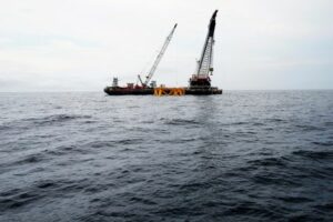 FILE PHOTO: A crane hangs over the first jacket support structure installed to support a turbine for a wind farm in the waters of the Atlantic Ocean off Block Island, Rhode Island July 27, 2015. REUTERS/Brian Snyder