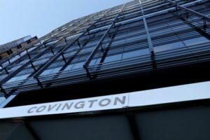 FILE PHOTO: Signage is seen outside of the law firm Covington & Burling LLP in Washington, D.C., U.S., August 30, 2020. REUTERS/Andrew Kelly