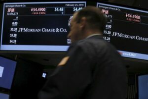 FILE PHOTO: A trader works by the post where JPMorgan Chase & Co is traded on the floor of New York Stock Exchange (NYSE) February 24, 2016. REUTERS/Brendan McDermid
