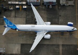An aerial view of a Boeing 737 MAX 10 airplane parked at King County International Airport-Boeing Field in Seattle, Washington, U.S, June 1, 2022. REUTERS/Lindsey Wasson
