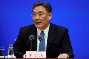 FILE PHOTO: Chinese Commerce Minister Wang Wentao speaks during a State Council Information Office news conference in Beijing, China February 24, 2021. REUTERS/Carlos Garcia Rawlins