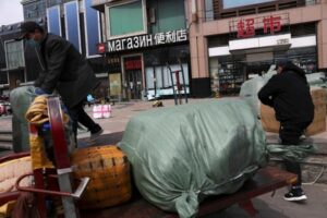 Men move bags of goods for export in front of a trading centre that houses shops and offices with Russian goods and services, in Beijing, China April, 1 2022. REUTERS/Tingshu Wang