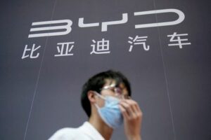 FILE PHOTO: A man adjusts his face mask as he walks past a BYD sign during a media day for the Auto Shanghai show in Shanghai, China April 20, 2021. REUTERS/Aly Song/File Photo