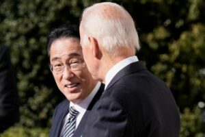 President Joe Biden greets Japanese Prime Minister Fumio Kishida on the South Lawn of the White House, Friday, Jan. 13, 2023, in Washington. Evan Vucci/Pool via REUTERS