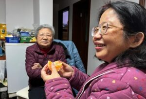 Chu Wenhong sits with her mother upon arriving from Singapore ahead of the Chinese Lunar New Year, her first time home since the coronavirus disease (COVID-19) pandemic, in Shanghai, China January 12, 2023. REUTERS/Xihao Jiang