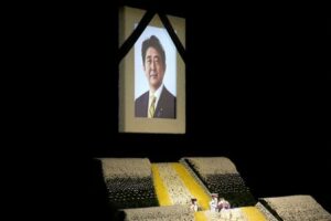 FILE PHOTO: The portrait of former Japanese Prime Minister Shinzo Abe is seen at the altar during his state funeral at Nippon Budokan, in Tokyo, Japan, September, 27, 2022. Eugene Hoshiko/Pool via REUTERS/File Photo