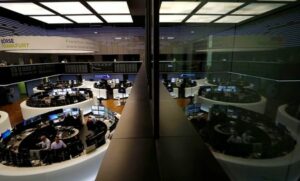 FILE PHOTO: A general view shows the trading floor at the stock exchange reflected in a window of the visitors terrace in Frankfurt, Germany October 2, 2017. REUTERS/Kai Pfaffenbach