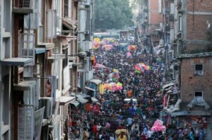 FILE PHOTO-Shoppers crowd at a market in Lagankhel, one of the busiest market in the country, during “Dashain”, the biggest religious festival of Hindus, amid the coronavirus disease (COVID-19) outbreak in Lalitpur, Nepal, October 8, 2021. REUTERS/Navesh Chitrakar
