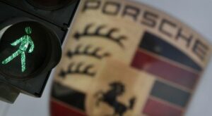 ARCHIV: Das Logo des deutschen Automobilherstellers Porsche vor einem Showroom