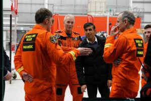 Britain’s Prime Minister Rishi Sunak listens to a crew member during a visit to a Coastguard search and rescue base at Inverness Airport, in Inverness, Britain January 12, 2023. Andrew Milligan/Pool via REUTERS