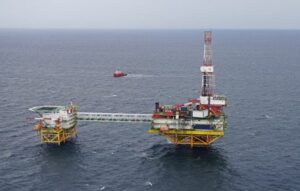 FILE PHOTO: An oil platform operated by Lukoil company is pictured from a helicopter carrying members of a local election committee and journalists during the early voting for the parliamentary election, at the Kravtsovskoye oilfield in the Baltic Sea, Russia September 16, 2021. REUTERS/Vitaly Nevar//File Photo