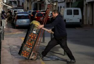 A worker pushes a cart with oranges outside a fruit January 13, 2023 January 13, 2023 A worker pushes a cart with oranges outside a fruit store in Ronda, Spain, January 13, 2023. REUTERS/Jon Nazca