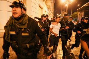 Security forces detain a demonstrator during a protest to demand the dissolution of Congress and democratic elections, in rejection of Dina Boluarte as Peru’s president, after the ouster of leftist President Pedro Castillo, in Lima, Peru, January 12, 2023. REUTERS/Sebastian Castaneda