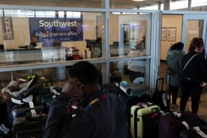 Southwest Airlines passengers wait in line at the baggage services office after U.S. airlines, led by Southwest, canceled thousands of flights due to a massive winter storm which swept over much of the country before and during the Christmas holiday weekend, at Dallas Love Field Airport in Dallas, Texas, U.S., December 28, 2022. REUTERS/Shelby Tauber