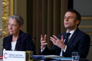 FILE PHOTO: French President Emmanuel Macron delivers a speech next to French Prime Minister Elisabeth Borne during the second plenary session of the Conseil National de la Refondation (CNR – National Council for Refoundation) at the Elysee Palace in Paris, France, December 12, 2022. REUTERS/Gonzalo Fuentes/Pool