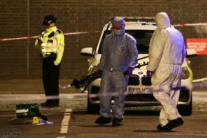 Forensics officers work at the scene of a shooting, the attack reportedly happened during a funeral at St Aloysius Church, in London, Britain, January 14, 2023. REUTERS/Henry Nicholls