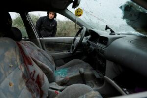 A Palestinian checks a damaged car where two militants were killed during an Israeli operation, near Jenin, in the Israeli-occupied West Bank, January 14, 2023. REUTERS/Raneen Sawafta
