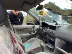 Palestinian checks damaged car where two militants were killed during an Israeli operation near Jenin in the Israeli-Occupied West Bank, January 14, 2023. REUTERS/ Ali Sawafta