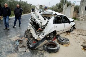 Foto del sábado del auto donde dos hombrs armados palestinos fueron ultimados por el Ejército israelí en Jenin, Cisjordania