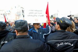 A demonstrator holds a placard during a protest against Tunisian President Kais Saied, on the anniversary of the 2011 uprising, in Tunis, Tunisia January 14, 2023. REUTERS/Zoubeir Souissi