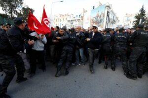 Demonstrators clash with police during a protest against Tunisian President Kais Saied, on the anniversary of the 2011 uprising, in Tunis, Tunisia January 14, 2023. REUTERS/Zoubeir Souissi